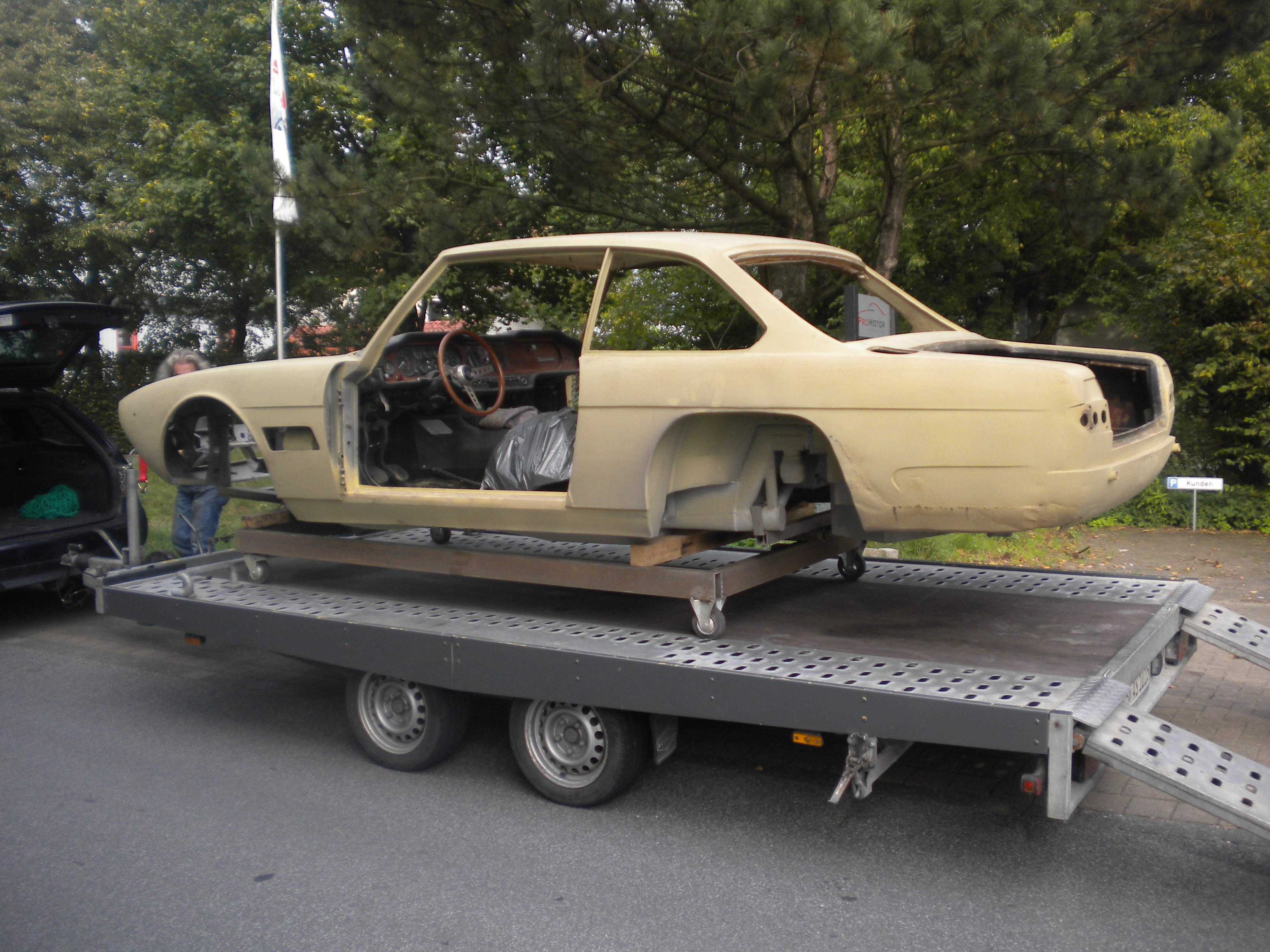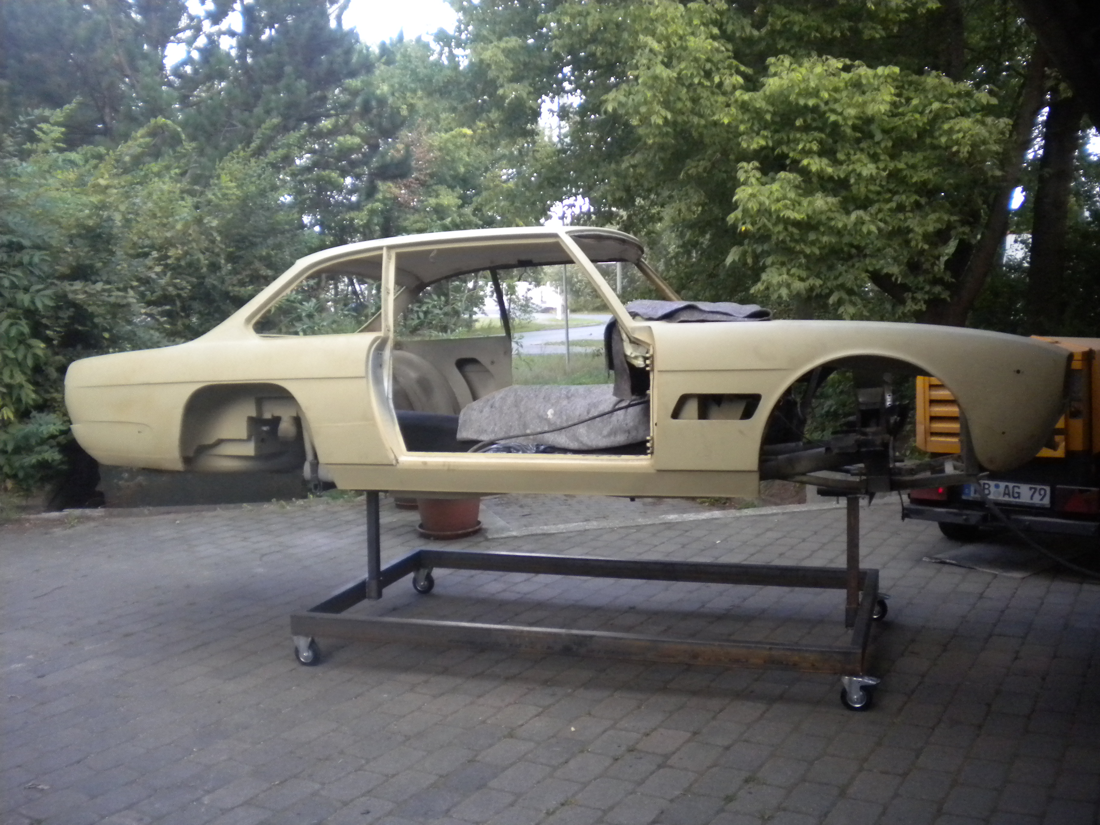 Feinstrahlen der kompletten karosserie eines 1970er MASERATI Mexico und Entfernung von Unterbodenschutz.